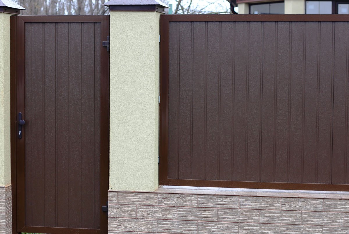 Материалы калитки и забора бывают одинаковыми или комбинированными. Глухая или прозрачная конструкция подбирается на усмотрение покупателя.