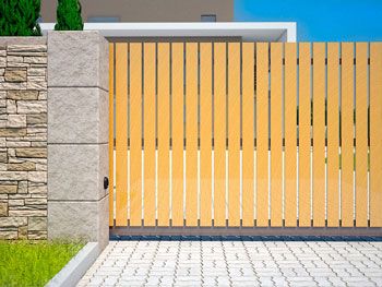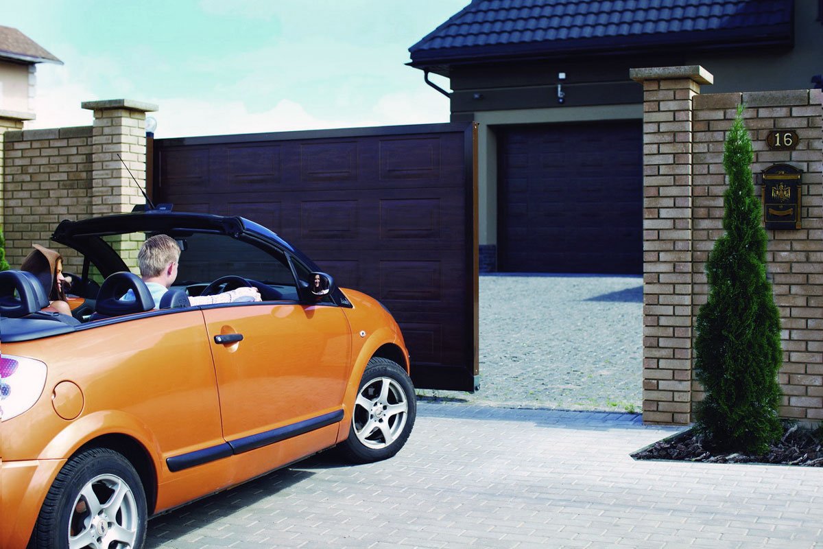 Традиционный распашной тип отличается высокой безопасностью. Створка открывается в одну сторону. Хорошо сочетается с общей конструкцией забора. Можно подобрать подходящий тип панели и цветовое оформление. В зависимости от конфигурации проема проводится открытие во двор или на улицу.